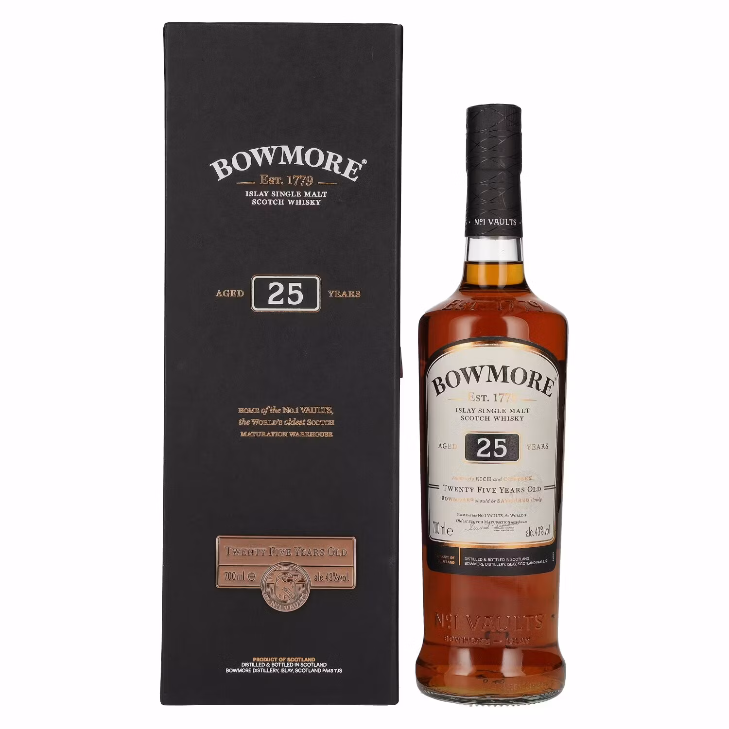 Bowmore 25 Years Old Islay Single Malt 43% Vol. 0,7l in Giftbox Skottland I lager. Artikelnummer: 683043 Dela Information Skottland