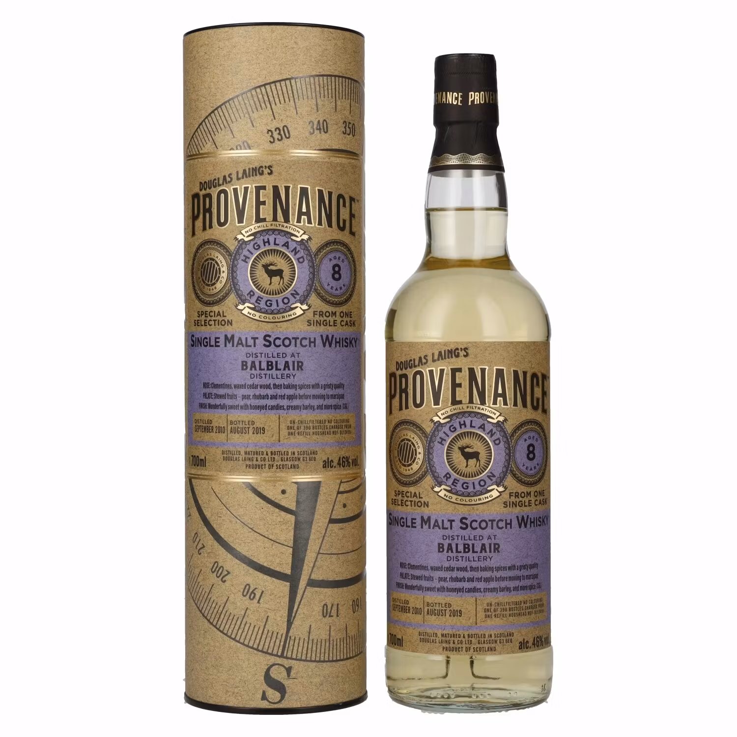 Douglas Laing PROVENANCE Balblair 8 Years Old Single Cask Malt 2010 46% Vol. 0,7l in Giftbox Skottland I lager. Artikelnummer: 683931 Dela Information Skottland