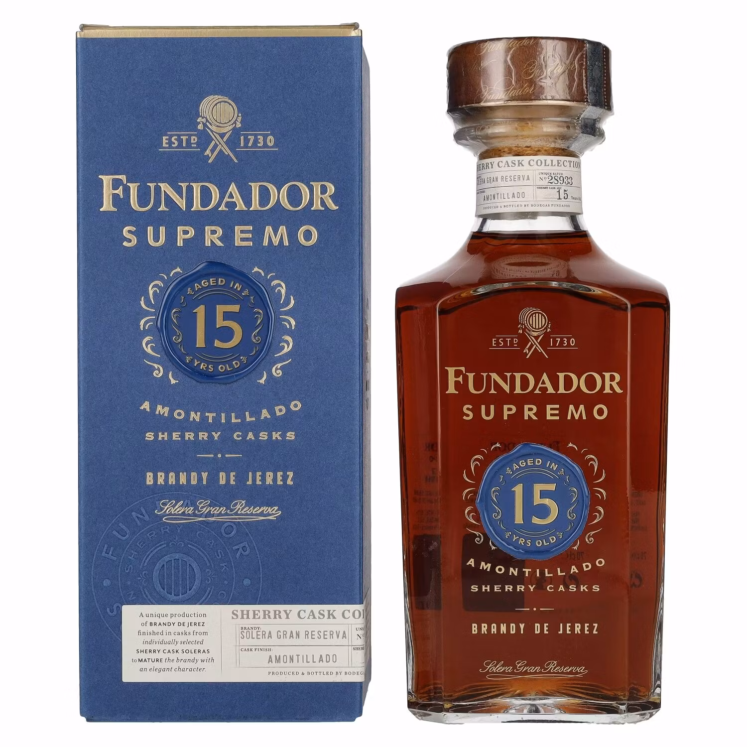 Fundador Supremo 15 Years Old Sherry Casks Brandy de Jerez 40% Vol. 0,7l in Giftbox Spanien I lager. Artikelnummer: 651119 Dela Information Spanien